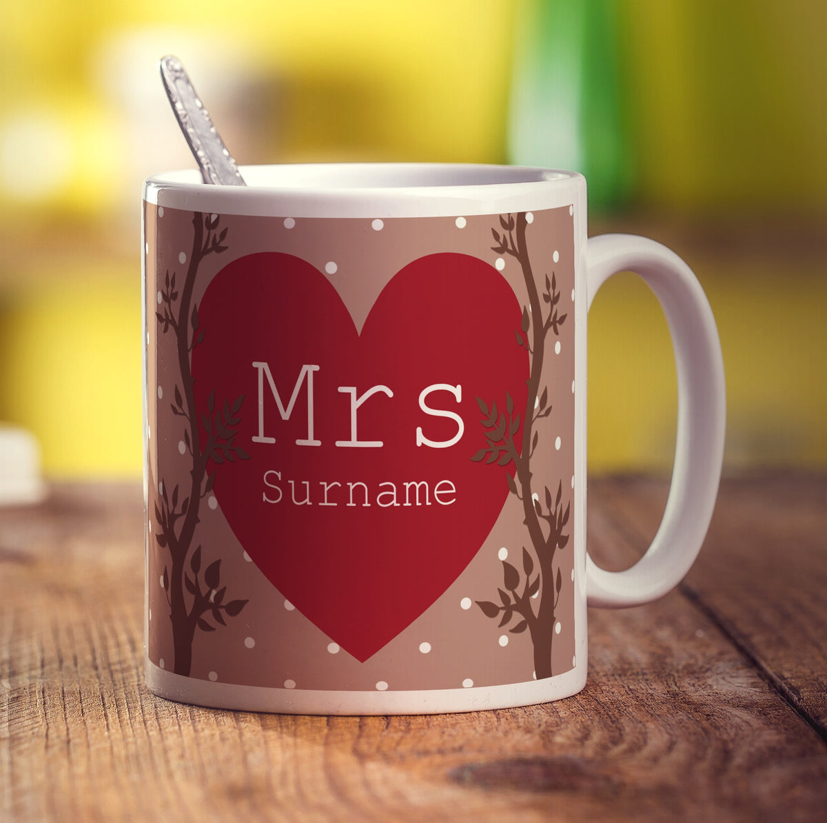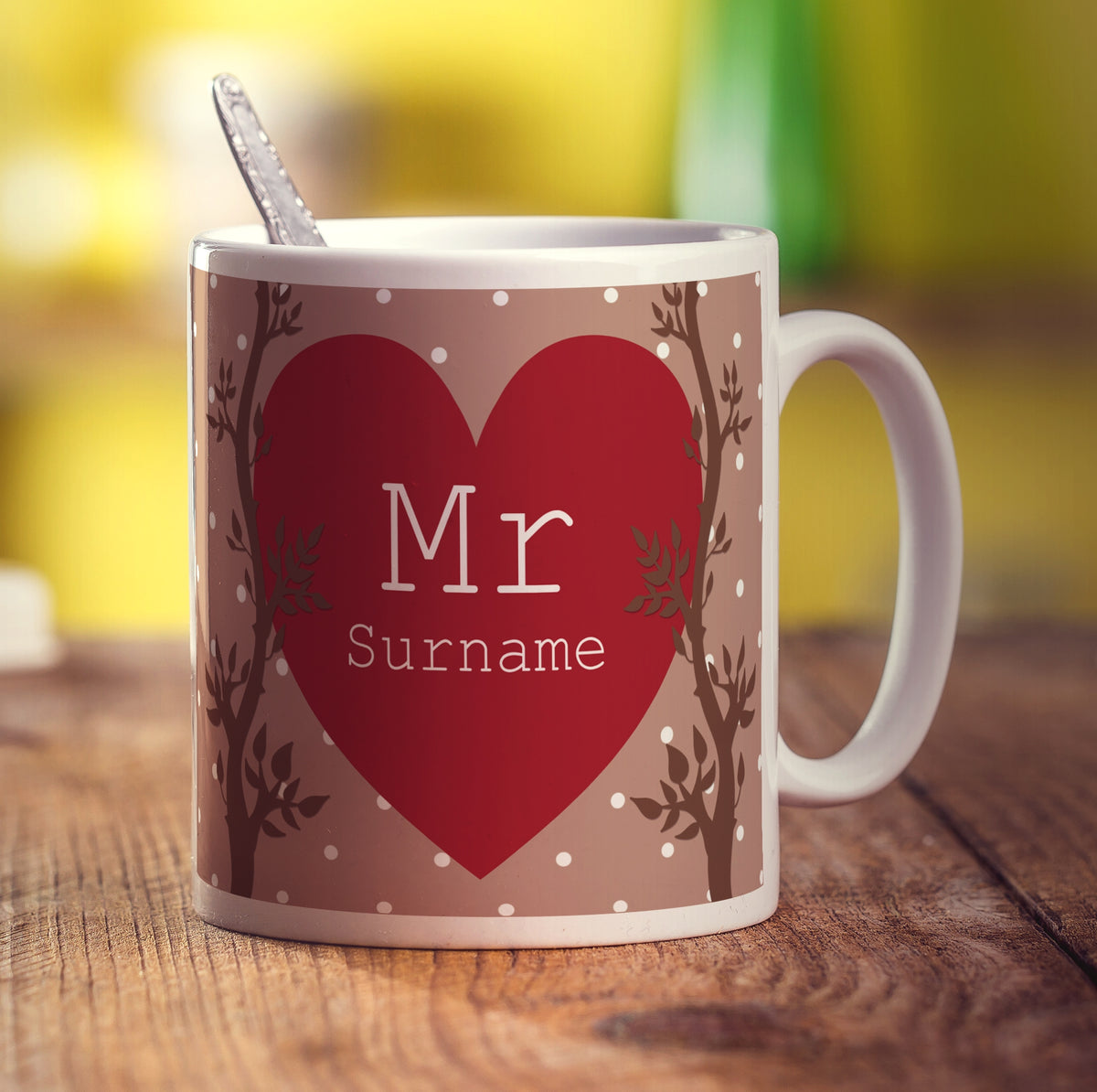 Brand New to our website today are these adorable 'Mr & Mrs' mugs featuring a vintage inspired Alpine Heart mug design which can be personalised with 'Any Surname.'