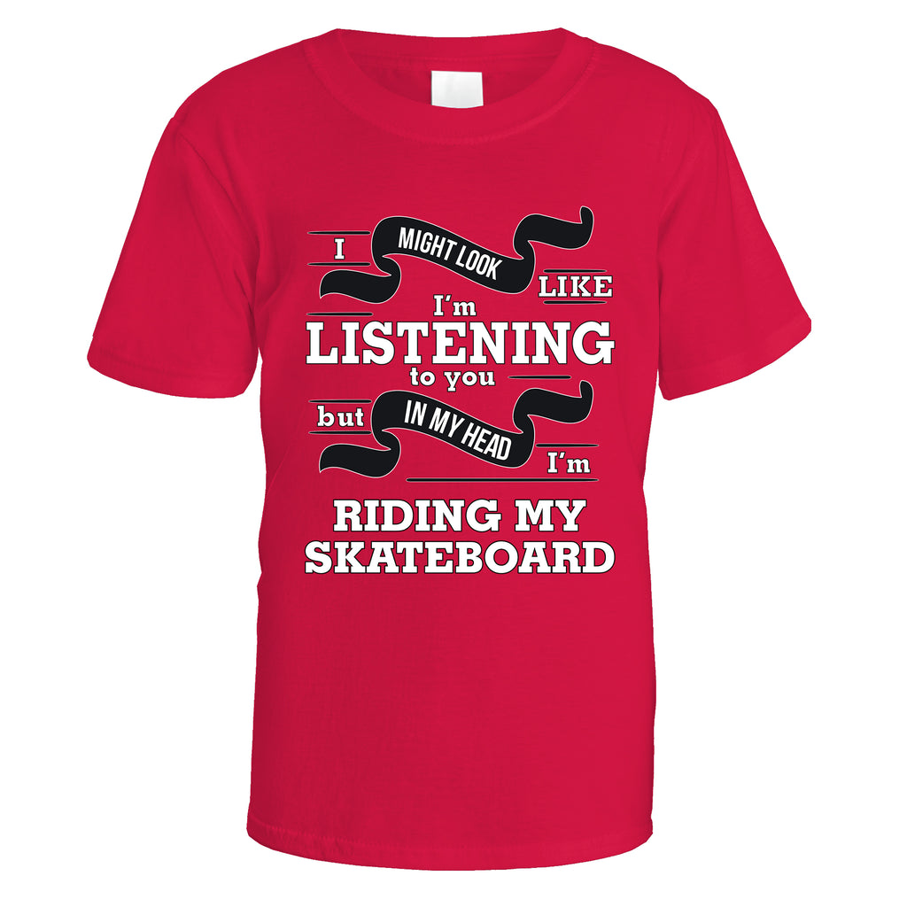 Slogan t-shirt with "I Might Look Like I'm Listening To You, But In My Head I'm Riding My Skateboard" printed on the front. The perfect gift for someone who'd rather be Riding Their Skateboard.